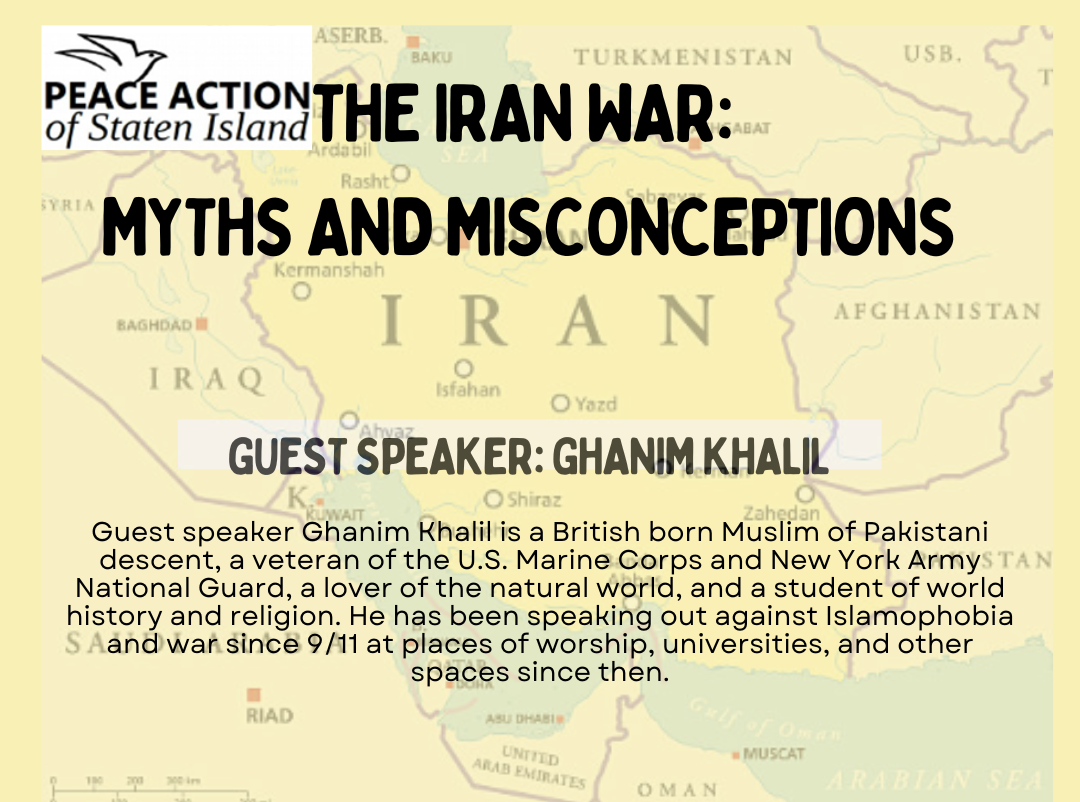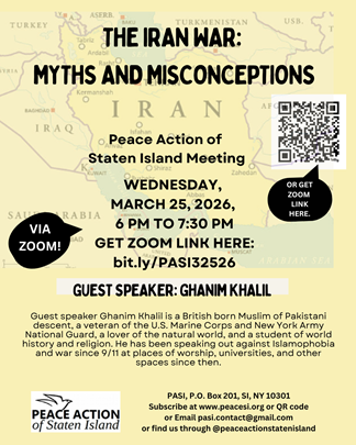 Because of the urgency to debunk some of the myths and misconceptions prevalent in the U.S. around Iran and the Iran War, PASI is holding its next meeting THIS WEDNESDAY at 6 PM by ZOOM with guest speaker Ghanim Khalil, who has been studying and addressing issues of war and Islamophobia for over twenty years.